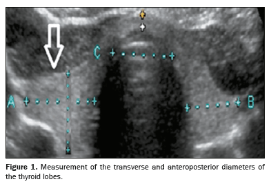 OBJECTIVE: To evaluate the relationship between the mean thyroid lobe diameter (MTLD) and the transverse tracheal diameter (TTD), as determined by ultrasound, in order to validate its efficacy as a quantitative marker of goiter.