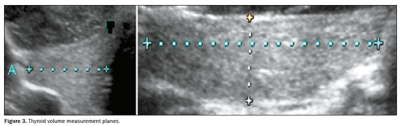 Ultrasound of the thyroid is a fundamental imaging modality for morphological assessment because of its noninvasive nature and high-resolution capability(5). Ultrasound B-mode imaging enables precise measurement of the dimensions of the lobes (transverse, anteroposterior, longitudinal), evaluation of echotexture, and nodule characterization. Doppler ultrasound further assesses vascular patterns within the thyroid gland(6). Standardized protocols, which ensure reproducible evaluation of thyroid volume and structural anomalies, are critical for goiter diagnosis and treatment response monitoring(7).
