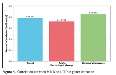 Analysis of the 300 thyroid ultrasound images revealed a significant positive correlation between MTLD and TTD in goiter cases (Pearson’s r = 0.78; p < 0.001). That correlation was consistent across age groups, being stronger in children/adolescents than in adults (r = 0.85 and r = 0.72, respectively), potentially reflecting developmental patterns of thyroid growth (Figure 4). The MTLD:TTD ratio emerged as a significant anatomical predictor, particularly for diffuse goiter subtypes. Interobserver agreement was excellent (intraclass correlation coefficient = 0.92; 95% CI: 0.88–0.95).