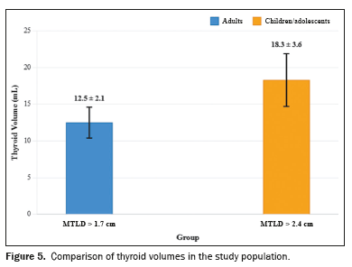 Subjects with an MTLD exceeding the normative TTD thresholds (> 1.7 cm in adults; > 2.4 cm in children/adolescents) demonstrated significantly elevated mean thyroid volumes (Figure 5): 12.5 ± 2.1 mL (normal range: 7–10 mL) among the adult patients, compared with 18.3 ± 3.6 mL (normal range: 5.0–16.1 mL) among the pediatric patients (p < 0.001). These volumetric deviations confirmed the diagnosis of goiter, according to the American Thyroid Association criteria(11) and to established specific sonographic criteria based on relative thyroid and tracheal dimensions indicative of pathological thyroid enlargement.