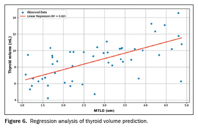 Linear regression analysis demonstrated that thyroid volume was strongly dependent on the MTLD (R² = 0.82; β = 1.34; p < 0.001). Each 1-cm increase in MTLD predicted a 1.34-mL increase in volume. The MTLD-TTD relationship explained 82% of the variation in thyroid volume (Figure 6). The MTLD:TTD ratio showed superior diagnostic performance, with a sensitivity of 89%, specificity of 93%, and Youden index of 0.82.