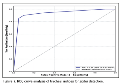 An abnormal tracheal index (1.7–2.4 cm vs. the observed mean of 2.6 ± 0.3 cm) was found to significantly improve goiter detection accuracy; the ROC curve analysis revealed an AUC of 0.94 (95% CI: 0.91–0.97), indicative of excellent discriminatory power (Figure 7). These findings suggest that changes in the dimensions of the trachea serve as valuable supplementary markers in the ultrasound assessment of thyroid enlargement.
