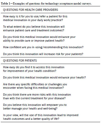 The first step is to identify the target audience; that is, to determine the key stakeholders involved in the adoption of the medical innovation. This could include health care professionals, patients, caregivers, administrators, and other relevant parties. To apply the TAM, there is a need to collect data to assess the PEOU and PU, conducting surveys or interviews to gather those data from your target audience, using questions such as those listed in Tables 1 and 2. Health care providers play a pivotal role in the successful implementation of medical innovations and must be targeted. In contemporary health care, patients are increasingly regarded as active participants in their own health care decisions. This perspective has gained prominence in the era of patient-centered care. The TAM can also be applied to comprehend patient attitudes toward medical innovations, because their acceptance and engagement are vital components of the overall success of health care innovations. Little et al.