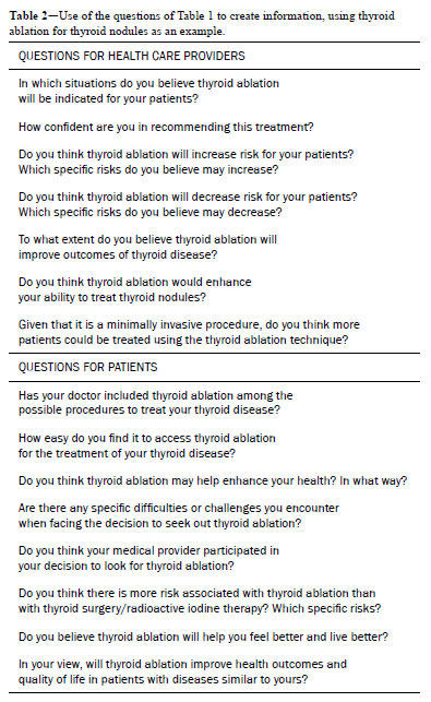 The first step in bringing about a paradigm shift should be an assessment of current opinions and attitudes of the target population. One must, therefore, begin to understand current patient attitudes and knowledge regarding IR and surgical procedures. This can be done through surveys, interviews, or focus groups. Correa et al. (unpublished data) assessed the impression of the population of the city of Passo Fundo, Brazil, in relation to physicians in the region. The analysis of those data identified the specific factors and attitudes that positively influence patients’ decision-making processes. These may include the risks, benefits, effectiveness, and comfort considered to be associated with each procedure.
