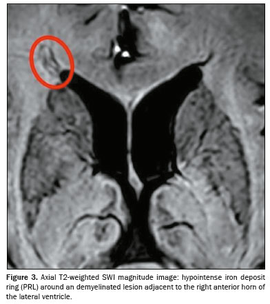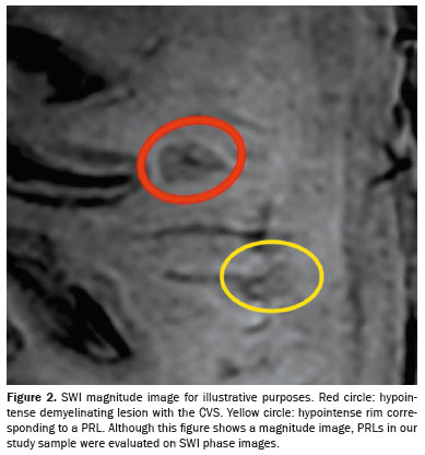 We found PRLs to be highly specific to the MS population, given that no PRLs were identified in the other groups and that all of our patients with MS had at least one PRL, as previously described(10,11). We find it interesting that the prevalence of PRLs was higher in our MS group, in which 35.7% of all lesions had a PRL, with a median per patient of 13.5. Although these values are higher than those reported elsewhere(10,11), they are in accordance with those reported in a recent systematic review and meta-analysis(22). This discrepancy might be explained by the fact that the participants in our MS group had greater disability (as assessed with the EDSS) and a relatively short disease duration, because some PRLs fade over time and because a PRL is a predictor of disability accrual(5,23,24). That further corroborates the potential role of PRL in driving clinical progression at a young age or a relatively short disease duration.