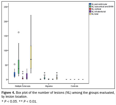 In the MS group, all of the patients had WMLs, of which a total of 1,697 were identified. In the migraine group, 14 patients (70%) patients had WMLs and a total of 96 WMLs were identified. None of the healthy controls had WMLs. Table 2 presents the number and characteristics of WMLs in each of the three groups.