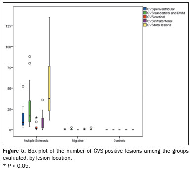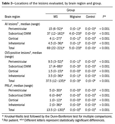 When comparing the total number of lesions, CVS positivity, and PRL presence, we found statistically significant differences in terms of the brain regions affected. The total numbers of lesions, CVS-positive lesions, and PRLs—in the periventricular, subcortical, cortical and infratentorial regions—were greatest in the MS group. The numbers of lesions identified in the migraine group were statistically equal to those identified in the control group, with the exception of the numbers of subcortical and DWM lesions, which were higher in the migraine group. We found CVS-positive lesions in all of the MS group patients. In the migraine group, such lesions were rare and, when present, were located primarily in the subcortical region or DWM. In our study sample, PRLs were identified only in the MS group. Table 3 details these comparisons.