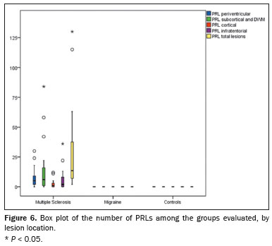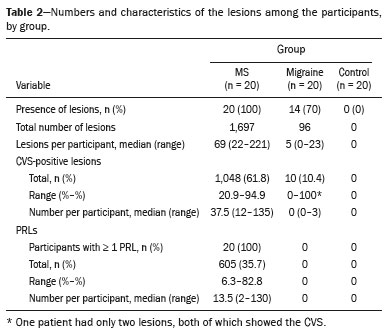 In our MS and migraine groups, the total number of lesions, as well as the prevalence of the CVS and PRLs, were higher among the subcortical and DWM lesions. That finding is in agreement with those of previous studies(11,21).