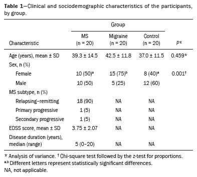This was a cross-sectional study that included participants recruited from the Neuroimmunology Outpatient Clinic and Headache Outpatient Clinic of the Hospital de Clínicas de Porto Alegre (HCPA), a tertiary care university hospital in the city of Porto Alegre, Brazil. The study was approved by the Research Ethics Committee of the HCPA (Reference no. GPPG 2019-0287), and all participants gave written informed consent.