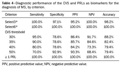 In terms of diagnostic performance, the 40% CVS threshold demonstrated lower accuracy in the present study than in previous studies. However, in our sample, the simplified CVS assessment criteria, including the select3* and select6* algorithms, which streamline the evaluation process, showed the potential for greater diagnostic accuracy compared with the more time-intensive analysis of all lesions(9). The discrepancy between our results and others in the literature may be attributed to the small sample size. However, our findings underscore the potential value of the CVS and PRLs as reliable biomarkers for distinguishing MS from migraine on MRI.