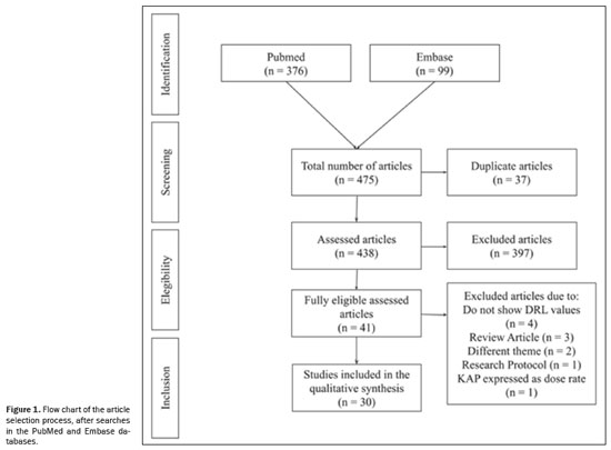 The search strategy included descriptors and their variations: Diagnostic reference levels; Radiology, interventional;Fluoroscopy;Tomography, X-Ray computed; Cholangiography; Image-guided biopsy; Catheterization; Balloon angioplasty;Cineradiography; Photofluorography; Cholangiography; Percutaneous transthoracic biopsy; Artery embolization;Neuroradiography; Cerebral ventriculography; Subtraction technique; Angiography; Cineangiography; Phlebography; Portography; Coronary angiography; and Arthrography.