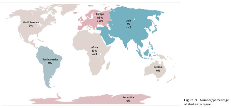 The geographic distribution of the studies included is shown in Figure 2. The European continent showed the highest number of DRL studies in interventional radiology, with the majority of those studies (n = 13) conducted in Germany. None of the studies selected were conducted in North America, Latin America, the Caribbean, Oceania, or Antarctica.
