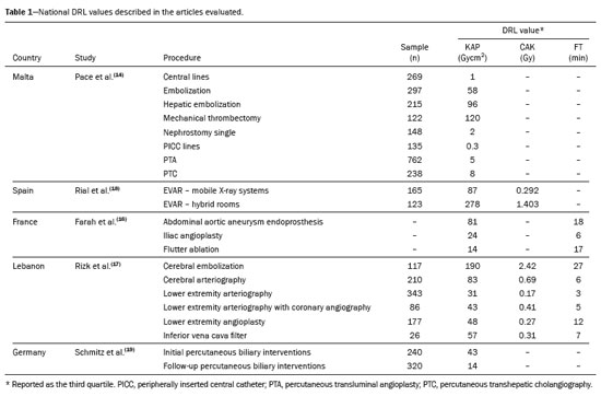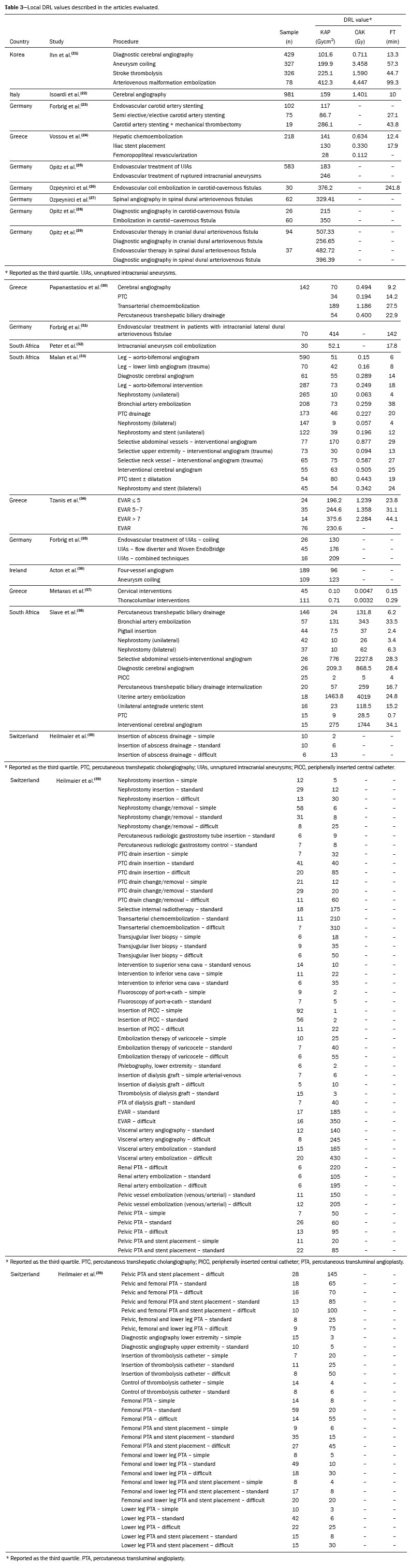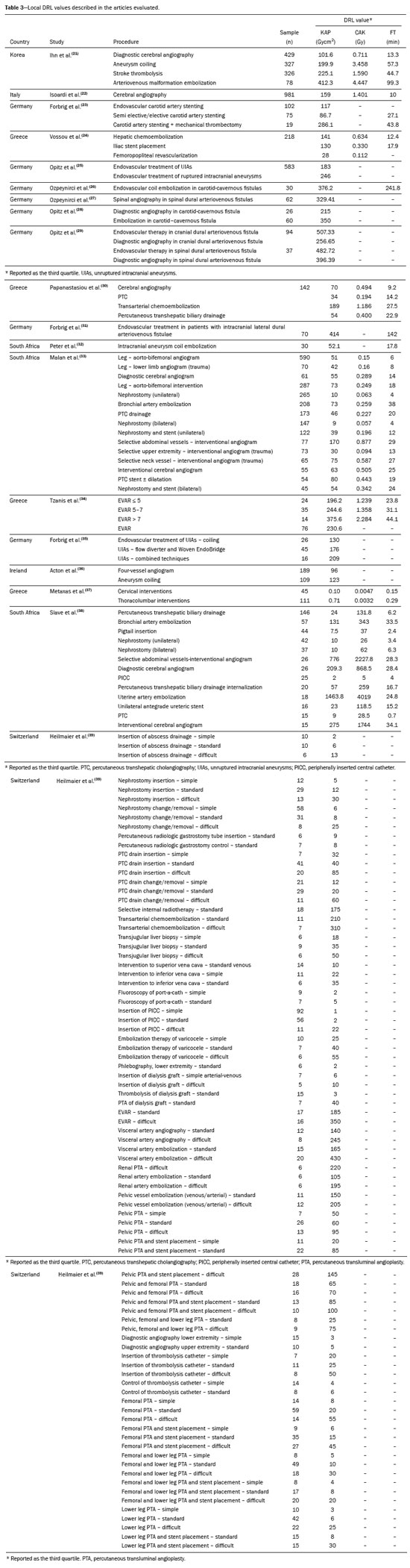 DISCUSSIONThis review provides a comprehensive overview of the scientific evidence available to establish DRL values in interventional radiology. The studies evaluated addressed a wide range of procedures. However, the lack of standardization in nomenclature across studies hindered the direct comparison of DRL values. The results indicated a predominance of studies conducted in Europe, especially in Germany. The complexity of procedures and the lack of consideration of that complexity were recurring challenges faced by researchers, suggesting the need for more refined approaches that include this factor. In addition, the use of dose management software has emerged as an effective strategy to facilitate data collection and the establishment of DRLs. Examples of commonly used dose management systems include DoseWatch (GE Healthcare, Buc, France), Radimetrics (Bayer Healthcare, Whippany, NJ, USA), and OpenREM (an open-source platform: https://openrem.org/).