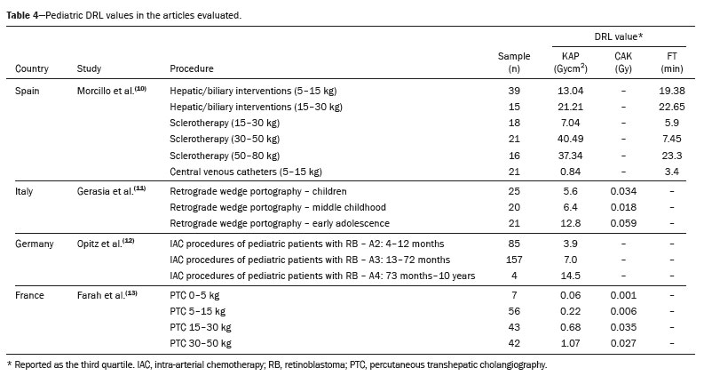 Pediatric DRLsAmong the studies selected, all pediatric DRLs were local (Table 4). The authors stratified their samples by body weight or age group. The procedure with the highest pediatric DRL values was sclerotherapy for patients weighing 50–80 kg, with DRL values for KAP and FT of 37.34 Gycm
