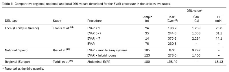 EVAR comparative analysisThe only procedure identified in studies of local, national, and regional DRL values was EVAR, although the EVAR classifications differed among them. As can be seen in the Table 5, the local DRL value for the KAP dose descriptor in the Tzanis et al. study