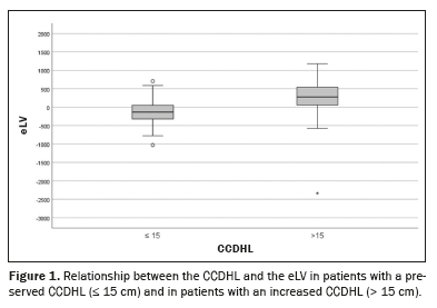 In the group with a preserved CCDHL (≤ 15 cm), the observed liver volume was, for the most part, smaller than expected. Conversely, in the group with an increased CCDHL (> 15 cm), the median eLV was positive, indicating that the observed liver volume was larger than expected.