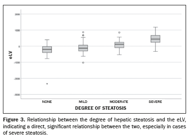 Correlation of sampling dataWhen evaluating the relationship between the degree of steatosis presented by the patient and the eLV, we found that the eLV increased progressively with an increase in the degree of steatosis. Patients with severe steatosis had markedly larger liver volumes (441.6 mL), indicating a direct, significant relationship, as further demonstrated in Figure 3. Patients without steatosis had, on average, lower-thanexpected liver volumes, whereas those with severe steatosis had significantly higher-than-expected liver volumes. That trend was evidenced by the progression in the median values, as well as by the broader interquartile ranges in severe cases. This pattern reflects the association between hepatic fat accumulation and increased liver volume.