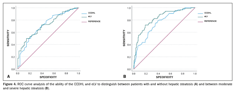 To evaluate the power of CCDHL and eLV in predicting the occurrence of steatosis or the development of moderate-to-severe steatosis, we performed a ROC curve analysis, calculating the AUC and the 95% confidence interval.