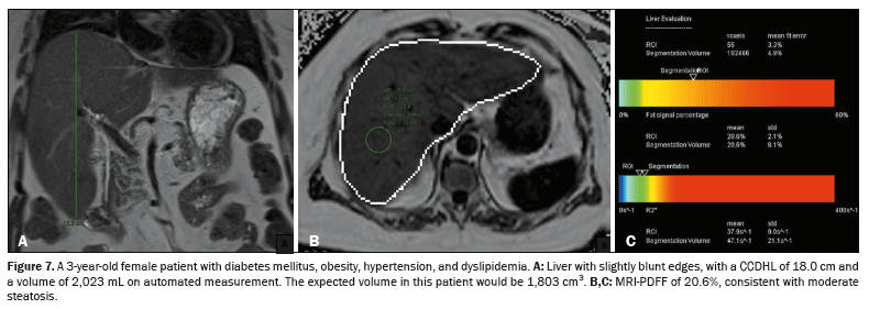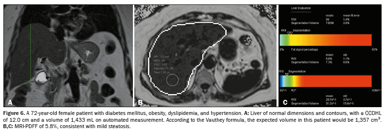 The MRI-PDFF has also been shown to correlate with the craniocaudal diameter of the right hepatic lobe (CCDHL), measured at the midclavicular line, which is a simple, accessible, reproducible measurement(8).