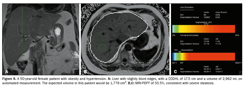 Automated liver volumetry represents a promising method in the structural evaluation of MASLD, offering greater accuracy, less interobserver variability, and rapid analysis of large volumes of data(6). The difference between the segmented liver volume on MRI and the expected liver volume (eLV), as determined with the Vauthey formula(7), is calculated to evaluate volumetric deviations.