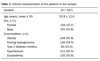 RESULTSClinical featuresThe sample consisted of 267 patients with a mean age of 52.8 years, as shown in Table 1. There was a balance between the proportion of men and women (52.8% and 47.2%, respectively). The most prevalent comorbidity was obesity (in 55.8%), followed by dyslipidemia (in 50.8%) and fasting hyperglycemia (in 54.4%), corroborating the strong association between hepatic steatosis and metabolic syndrome.