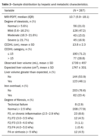 MATERIAIS E MÉTODOS: Estudo transversal, unicêntrico e prospectivo incluindo 289 pacientes submetidos a ressonância magnética multiparamétrica para avaliação da esteatose hepática, a qual foi determinada pelo valor de PDFF-MRI. As medidas de tamanho do fígado incluíram DCCLH, volume hepático de segmentação automatizada e a sua diferença em relação ao volume hepático total esperado (Voe), calculado pela fórmula de Vauthey.