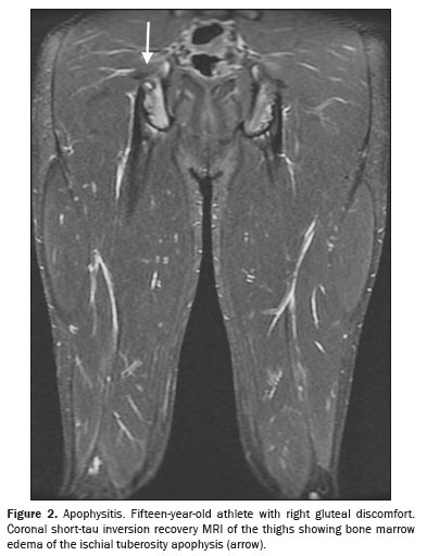 The MRI scans of the thighs were performed in a 1.5-T scanner (Optima MR 360; GE Healthcare), employing T1-weighted and short-tau inversion recovery sequences in the axial and coronal planes, without the use of intravenous contrast. The MRI criteria for diagnosing avulsion fracture included apophyseal displacement, bone edema, physeal hyperintensity, periphyseal edema, and intermuscular fluid collections. Bone and periphyseal edema without displacement was deemed indicative of apophysitis.