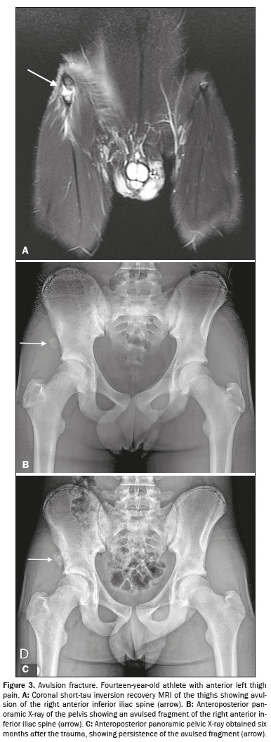OBJECTIVE: To evaluate, primarily, the accuracy of plain radiography (X-ray) in diagnosing apophyseal avulsion fractures in adolescent soccer players, using magnetic resonance imaging (MRI) as the gold standard. As secondary objectives, we investigated associations between findings on X-ray, MRI, and power Doppler, as well as the imaging features that distinguish avulsion fractures from apophysitis.