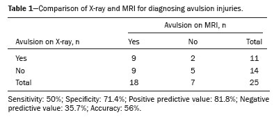 MATERIAIS E MÉTODOS: Estudo observacional e transversal realizado com 33 atletas do sexo masculino, com idades entre 9 e 17 anos, com suspeita clínica de fratura avulsiva apofisária. Os exames foram realizados em até 24 horas após o trauma. Avaliaram- se a reprodutibilidade diagnóstica entre leitores, a acurácia da radiografia simples em relação à RM e as associações entre os diferentes métodos de imagem.