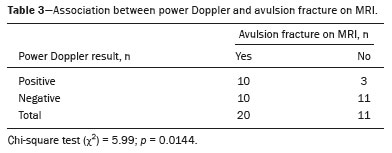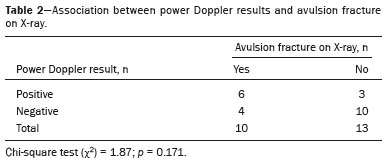 (16). In our study, we found an association between abnormal power Doppler vascular flow and avulsion fracture detected by MRI; all 10 cases with vascular hyperemia also had avulsion fractures. Conversely, the absence of vascular flow was nonspecific, occurring at similar rates in the avulsion and non-avulsion groups. There was no significant association between power Doppler positivity and avulsion fracture identified by X-ray, although a larger sample may be needed in order to confirm this finding.