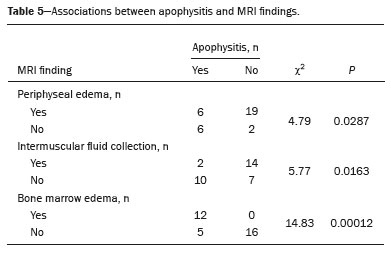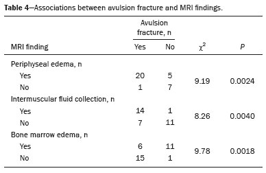 RESULTS: We found that X-ray had an accuracy of 56.0%, with high specificity (71.4%) and positive predictive value (81.8%), although its sensitivity and negative predictive value were relatively low (50.0% and 35.7%, respectively). The power Doppler result was significantly associated with avulsion fractures detected on MRI (p = 0.0144). Avulsion fractures were associated with periphyseal edema and intermuscular fluid collections, while apophysitis was associated with bone marrow edema.