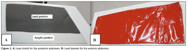 The posterior abdominal lead shield (Figure 1A) was made of 3-mm-thick PMMA, double-folded in a "wallet" shape, measuring 65.0 × 65.0 cm. Within this base, two 0.25-mm lead sheets, each measuring 65.0 × 42.5 cm, were inserted. The posterior shield was designed to be inserted between the procedure table and the mat upon which the patient lies. The blanket (Figure 1B) was made of washable canvas with two 0.25-mm lead sheets, each measuring 45.0 × 110.0 cm. The two shields together function as a barrier equivalent to 0.5 mm of lead.