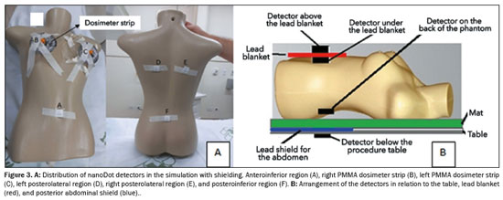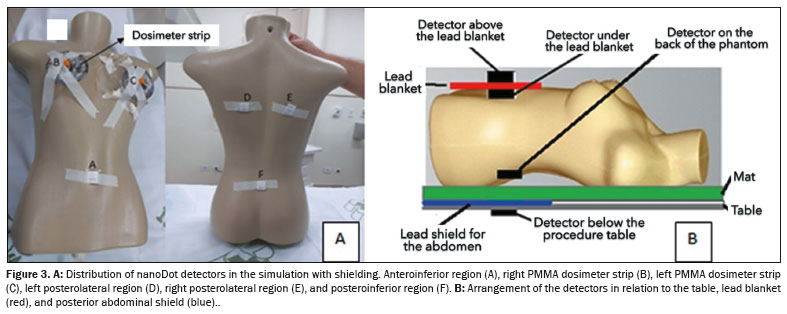 The phantom (Figure 3A) was developed from a polyurethane mannequin, with circumferences of 78 cm at the bust, 61 cm at the waist, 80 cm at the hip, and 15 cm around the shoulder, as well as a 40 cm width at the back, a shoulder-to-waist height of 37 cm, a waist-to-hip height of 15 cm, and a shoulder-to-hip height of 53 cm. The nipple regions were removed for the introduction of the dosimeter strips, and the phantom was filled with water. Figure 3A shows the distribution of the detectors, which allowed the verification of the incident radiation entering the skin until its attenuation as it passed through the phantom, resulting in residual radiation. Two detectors were positioned directly on the phantom, and eight were distributed along the two dosimeter strips. To verify the effectiveness of the pelvic-abdominal shield and the lead blanket, six detectors were positioned, as shown in Figures 3A and 3B: one under the procedure table, 5 cm from the upper end of the shield; one on the lead blanket; one under the blanket; three on the back of the phantom (in the right posterolateral region, left posterolateral region, and central dorsal region, respectively).