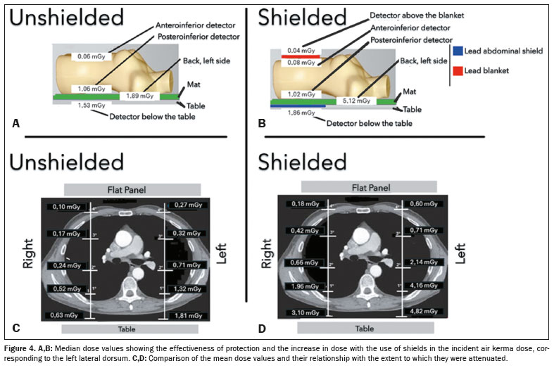 The comparison of the doses received at the detectors in the region of the posteroinferior abdominal lead shield did not reveal a statistically significant difference between the shielded and unshielded groups. However, when observing the median values for the detectors under the table, we found an attenuation of 30.72% in the unshielded group, compared with 45.16% in the shielded group. The doses received at the detectors in that position were 3.77% higher in the unshielded group than in the shielded group. However, the median entrance dose to the left back of the phantom (within the primary beam) was significantly (170.9%) higher in the shielded group.