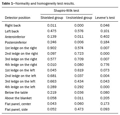 Data were analyzed to determine whether the assumptions of normality and homoscedasticity were satisfied. The Shapiro-Wilk test was applied to assess normality, and Levene's test was applied to assess the homogeneity of variances (Table 1). However, for most detector positions, the assumption of normality was not satisfied at the 5% significance level. Descriptive statistics for the radiation dose variable were calculated according to shielding condition and detector position. The data are presented as mean and standard deviation or as median. Comparisons between groups (with and without shielding) were performed using the nonparametric Mann-Whitney-Wilcoxon test.