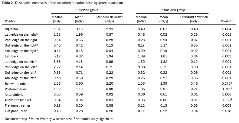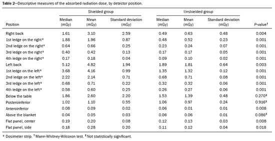 p-values below 0.05. The median radiation dose was higher in the shielded group than in the unshielded group. Only three detectors (the one under the table, the posteroinferior one, and the one above the blanket) did not show statistical significance. Analysis of the detector data on the dosimeter strips showed that, regardless of the irradiated side, the doses received at the deeper ledges and at those closest to the back of the phantom were lower than were those received in the anterior region.