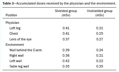 Table 3 shows the doses recorded by detectors positioned on the physician and at locations around the procedure room. For most of the doses recorded, the values were higher in the shielded group than in the unshielded group.