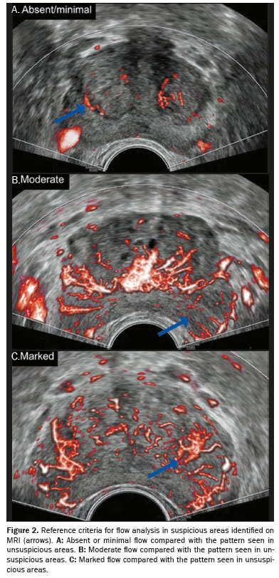 Vascular flow was categorized on the basis of the MVF pattern in the MRI-identified suspicious area (Figure 2), in comparison with the rest of the gland, as follows: absent or minimal; moderate; or marked.