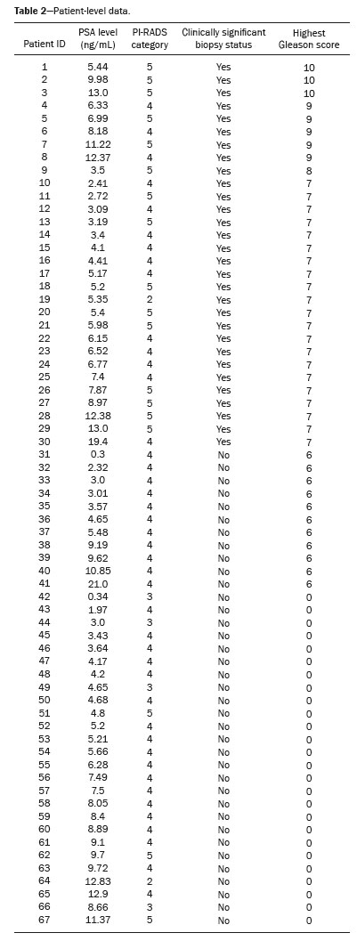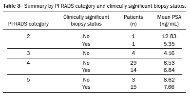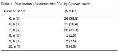 The Gleason score is a histopathological score that assesses tumor aggressiveness on the basis of biopsy samples(10). Patients were divided into two groups, by Gleason score (Table 1): ≥ 7 (clinically significant; n = 30); and ≤ 6 (clinically insignificant; n = 37).